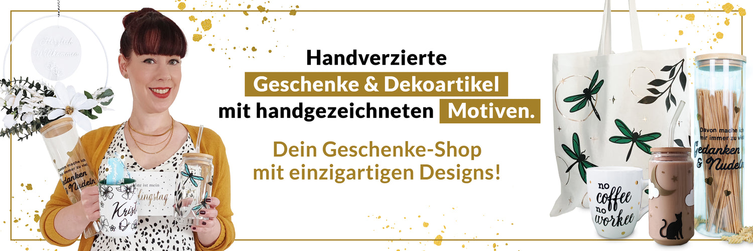 Entdecke liebevoll gestaltete Geschenke und bewusst ausgewählte Lieblingsstücke, die das Leben schöner machen. Alle Produkte im Shop sind einzigartig, da die Motive von Hand gezeichnet sind und die Geschenkartikel von Hand veredelt werden. Dafür werden ausschließlich hochwertige Materialien verwendet und jede Deiner Bestellungen wird persönlich bearbeitet.