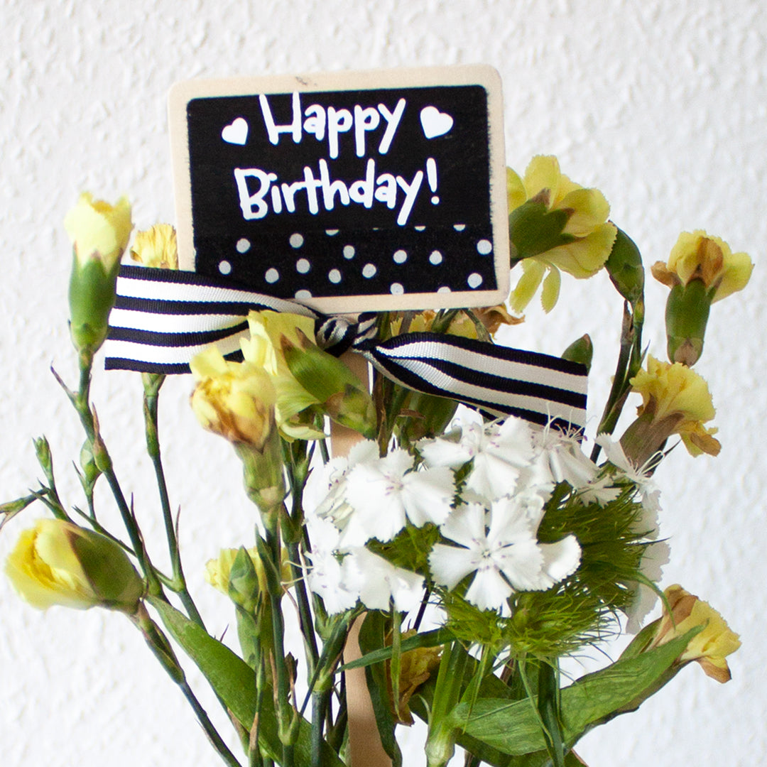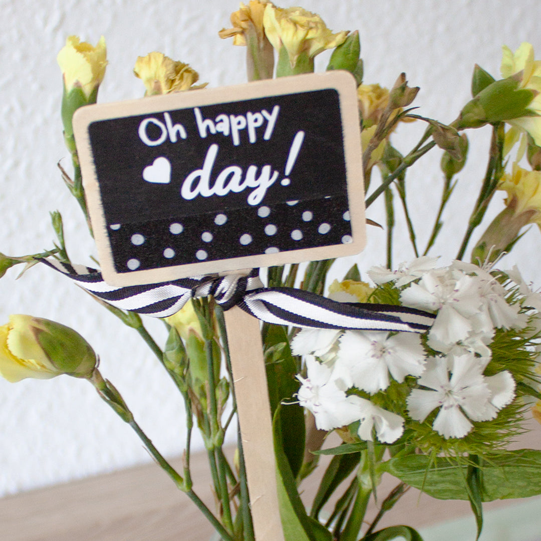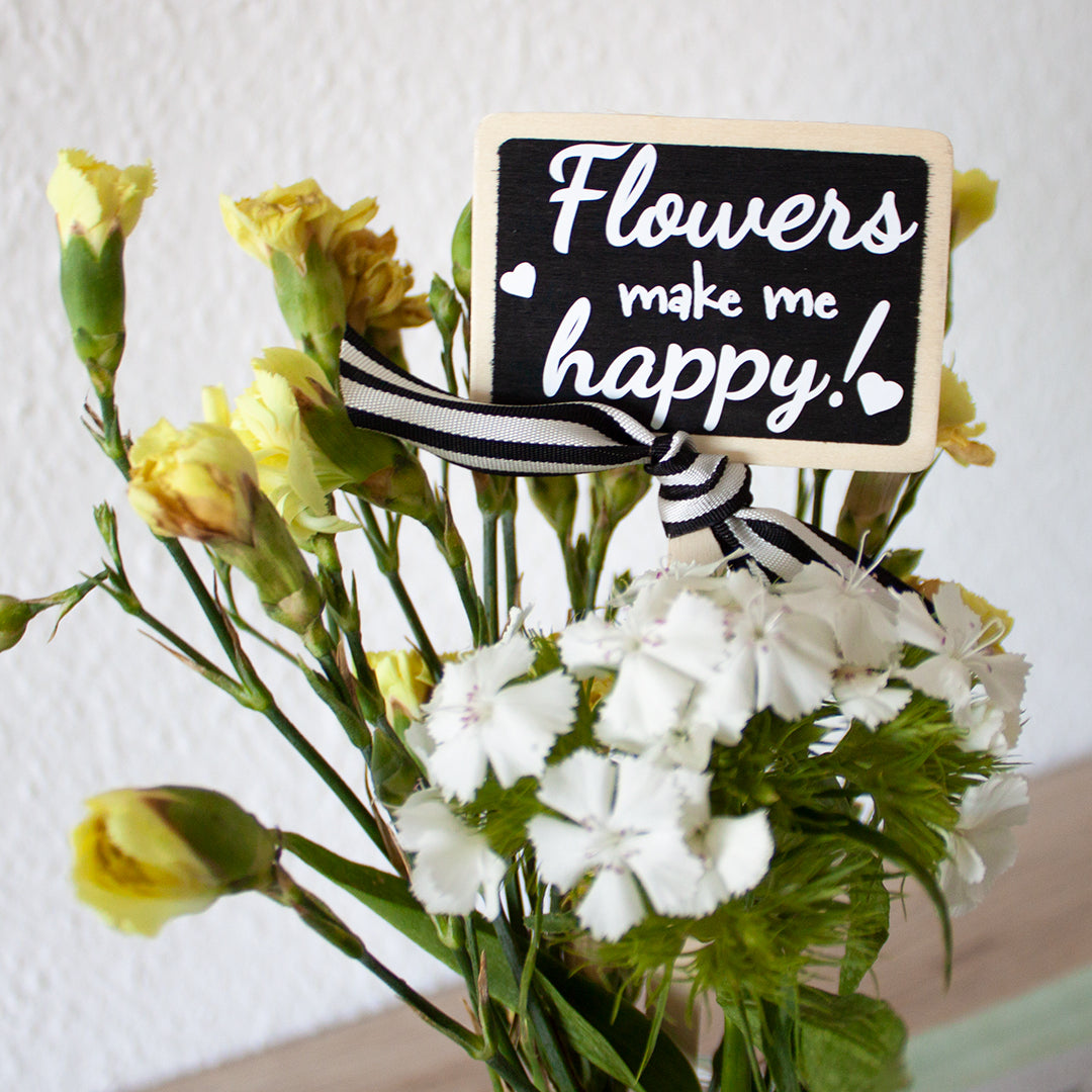 Ein passender Blumenstecker mit einem lieben Gruß rundet das Geschenk ab.