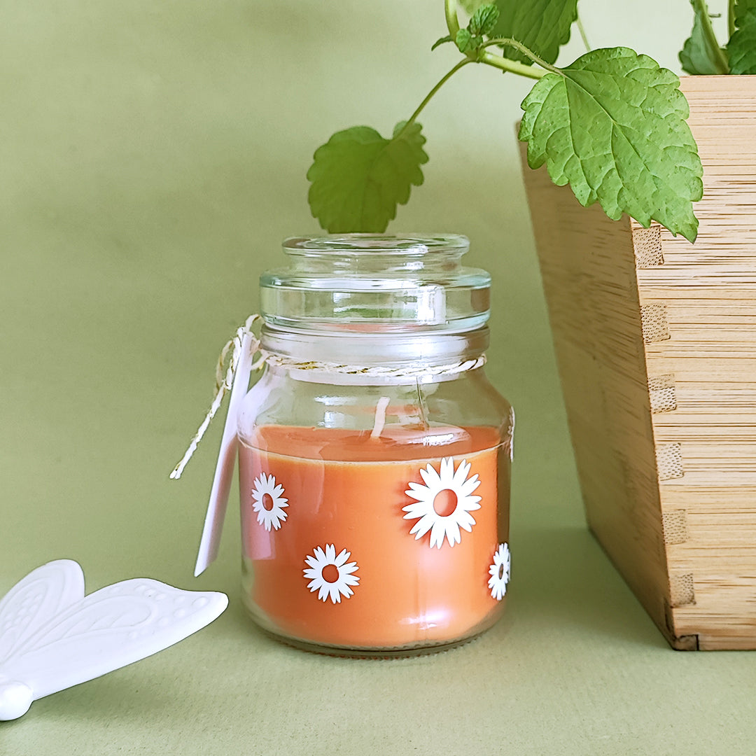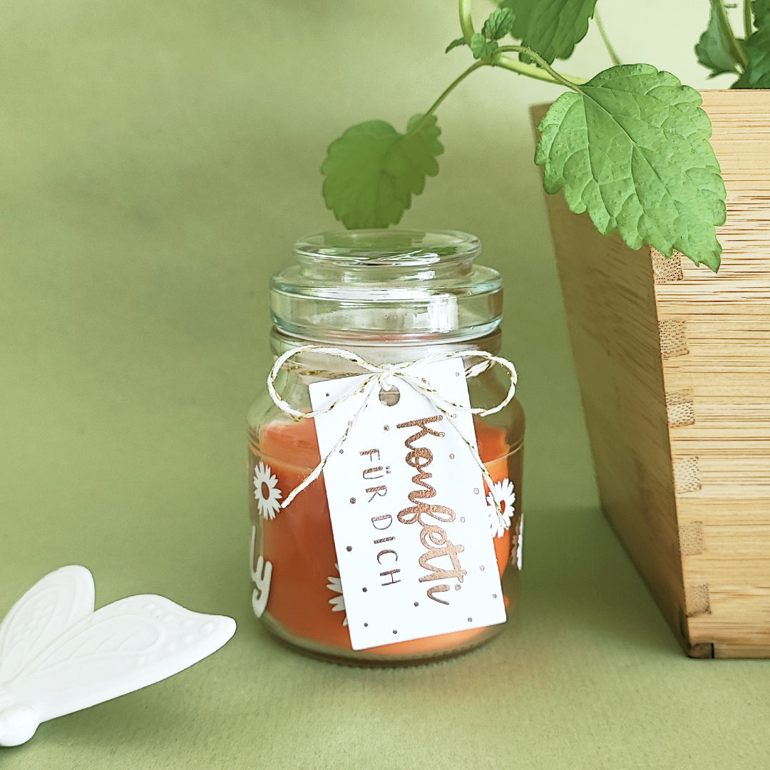 Handverziert mit süßen Gänseblümchen und einem Etikett, das Du beschriften kannst, wenn Du die Duftkerze verschenken möchtest.