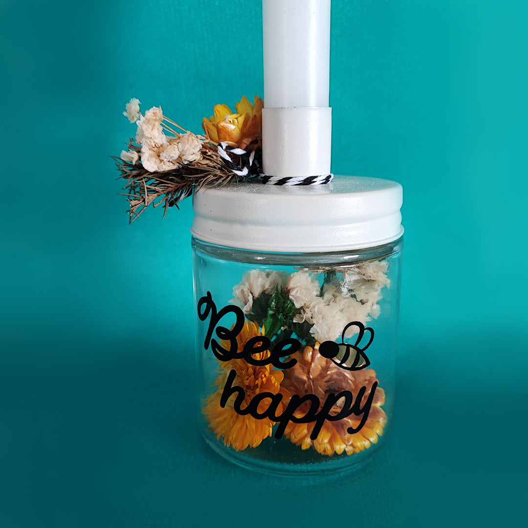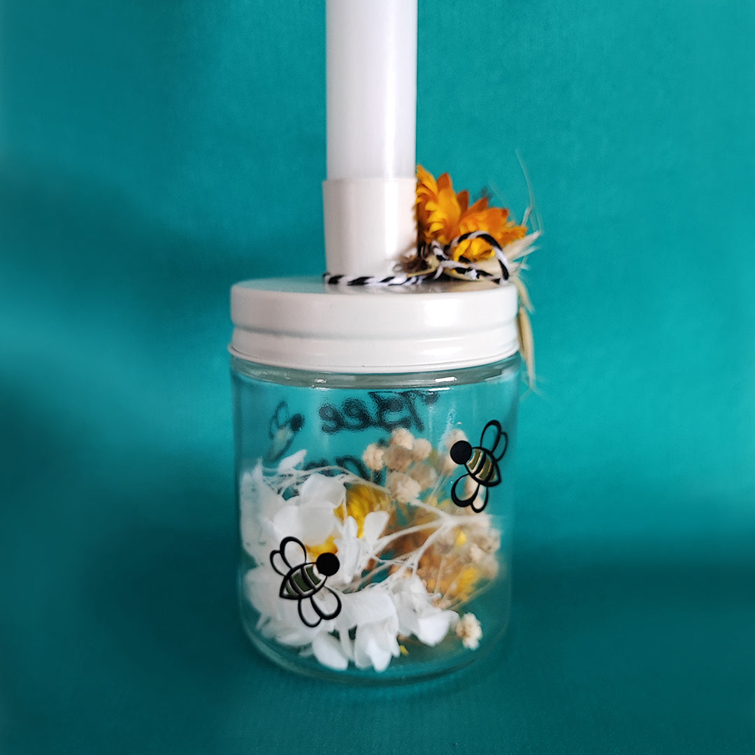 Eine weiße Kerze und Trockenblumen sind im Lieferumfang enthalten.
