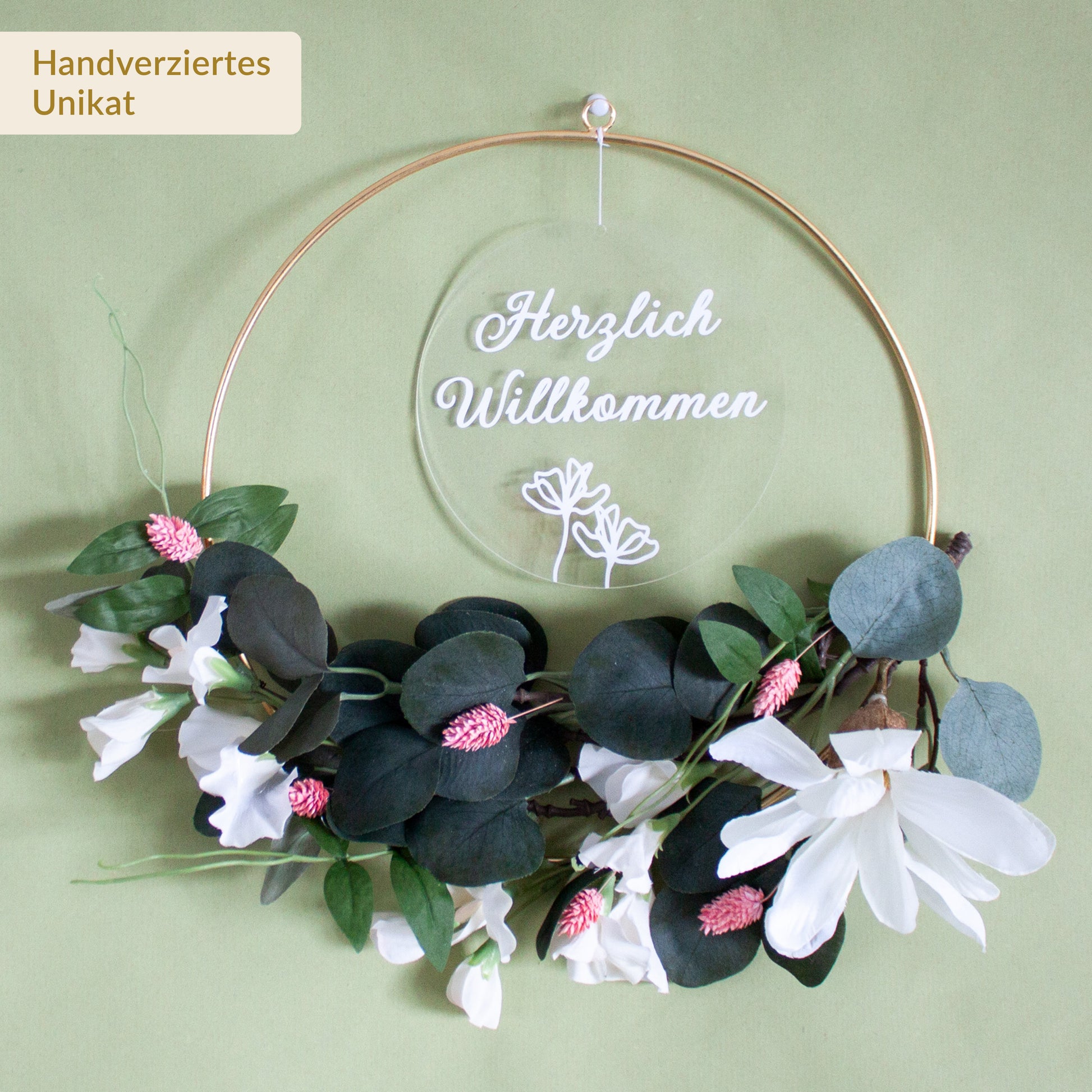 Der wunderschöne Türkranz ist mit Seidenblumen, die das ganze Jahr über in voller Blüte stehen und einem charmanten Schild "Herzlich Willkommen" verziert.